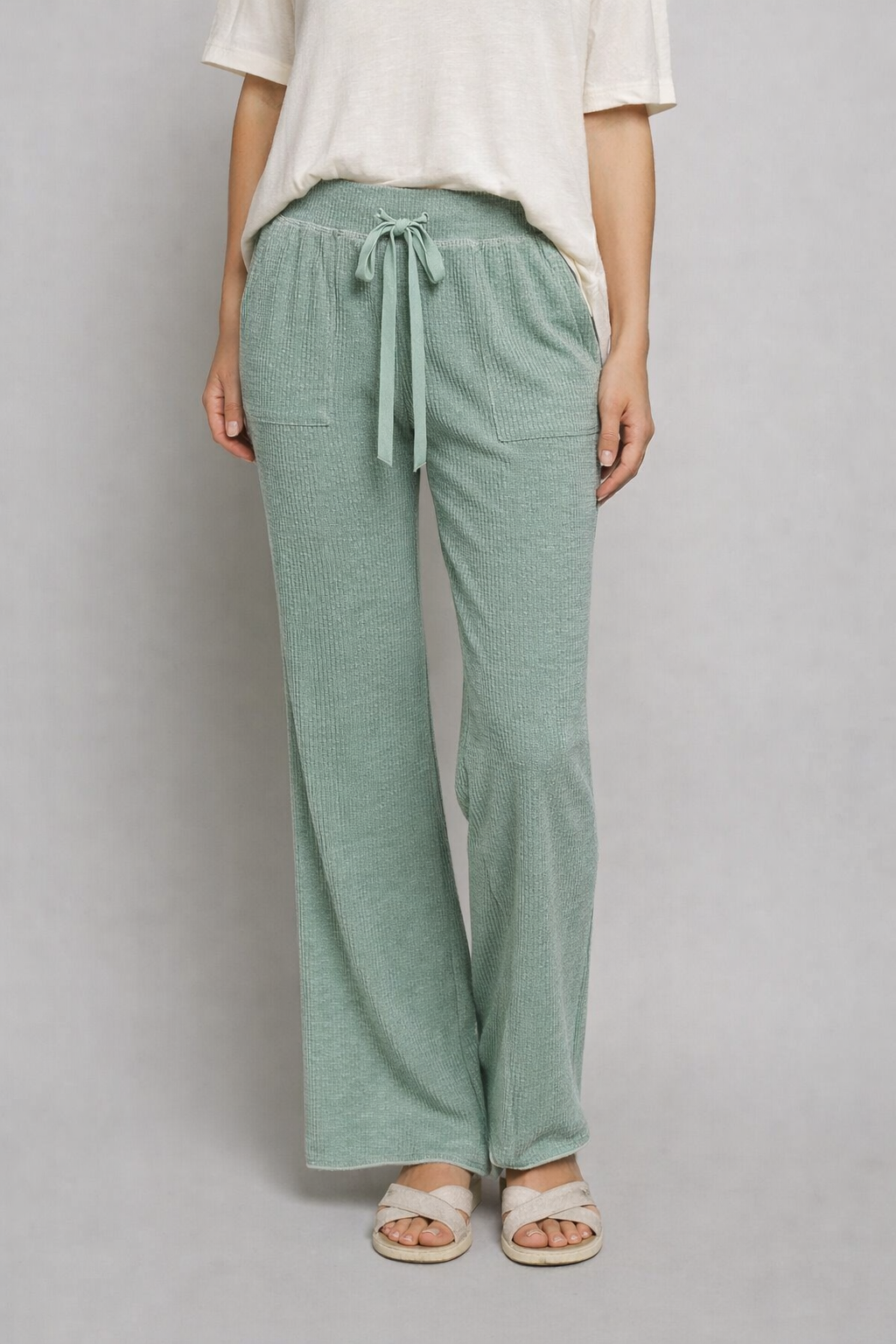 These ribbed knit flare leg lounge pants offer a blend of comfort and style. Crafted from a soft, breathable ribbed knit fabric, they feature a relaxed fit and a flared leg design for a fashion silhouette. The drawstring waistband ensures a comfortable and adjustable fit, while the side pockets add practicality. Perfect for lounging at home or casual outings, these pants are a versatile addition to any wardrobe. The light green color adds a touch of freshness and sophistication. Material: Knit fabric.