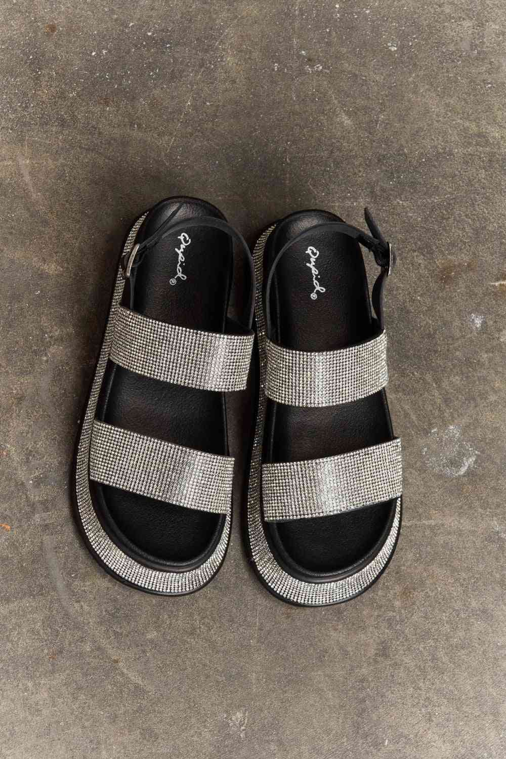 Elevate your footwear game with this dazzling flatform style, designed to add a touch of glamour to any outfit. The two bands of shimmering rhinestones create a captivating sparkle that will catch everyone's eye as you walk. With a secure and comfortable fit, thanks to the slingback strap, you can confidently step out in style all day long. Embrace the elegance and radiance of these sandals, perfect for any occasion where you want to shine and stand out from the crowd.